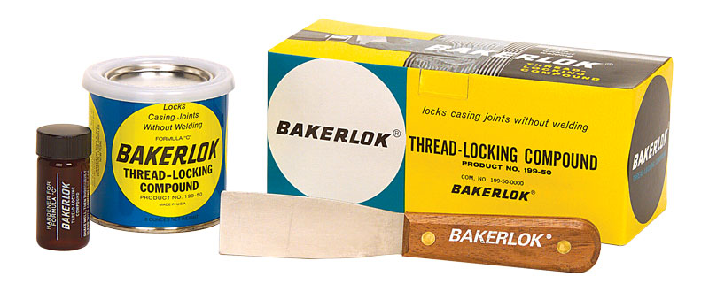 Fast Cure BAKERLOK Thread-Locking Compound replaces welding for casing joints on the bottom lengths to prevent unscrewing while drilling out cement. Welding of shoes, couplings, and collars to casing often weakens the casing and should be avoided wherever possible.